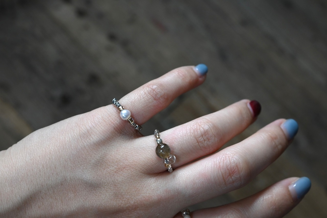 スモーキーなカラーとシルバーを合わせた、落ち着きのある3点。