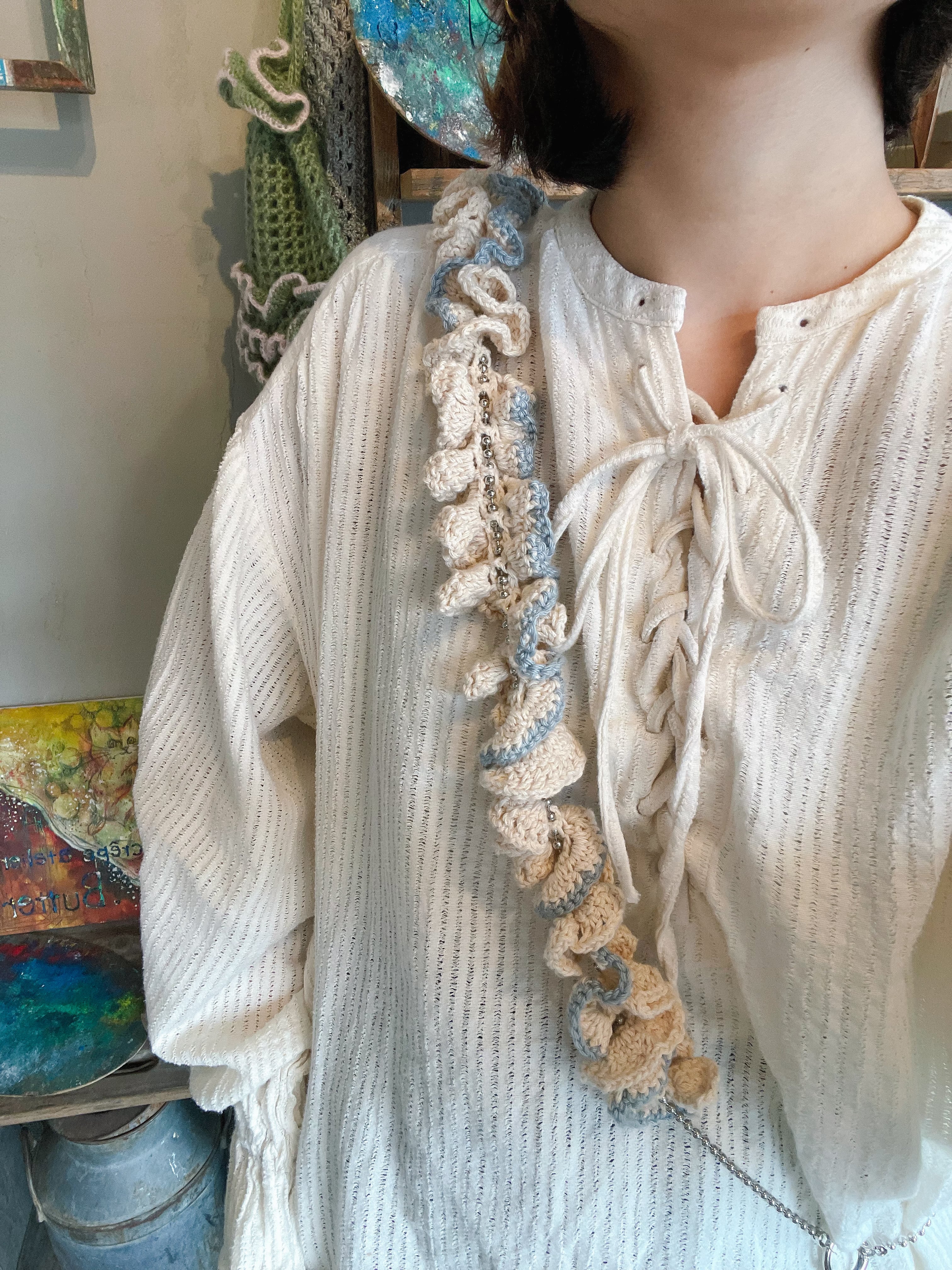 アイボリーとスカイブルーが織りなす、柔らかな色合いのショルダーストラップ。