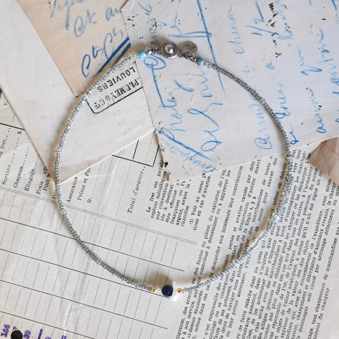 lapis lazuli × beads necklaceは、深みのあるブルーが美しいラピスラズリを使用した、華奢で上品なデザインのネックレスです。アンティーク調のグレービーズが首元に繊細な輝きを添え、シンプルなスタイルにも上質なアクセントをプラスします。日常使いはもちろん、特別なお出かけにも寄り添う、大人のための一品です。